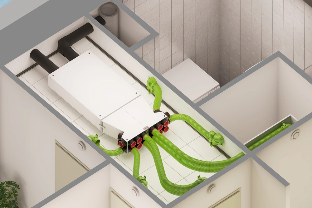 - Mažos energijos sąnaudos dėl „Constant flow” ventiliatorių