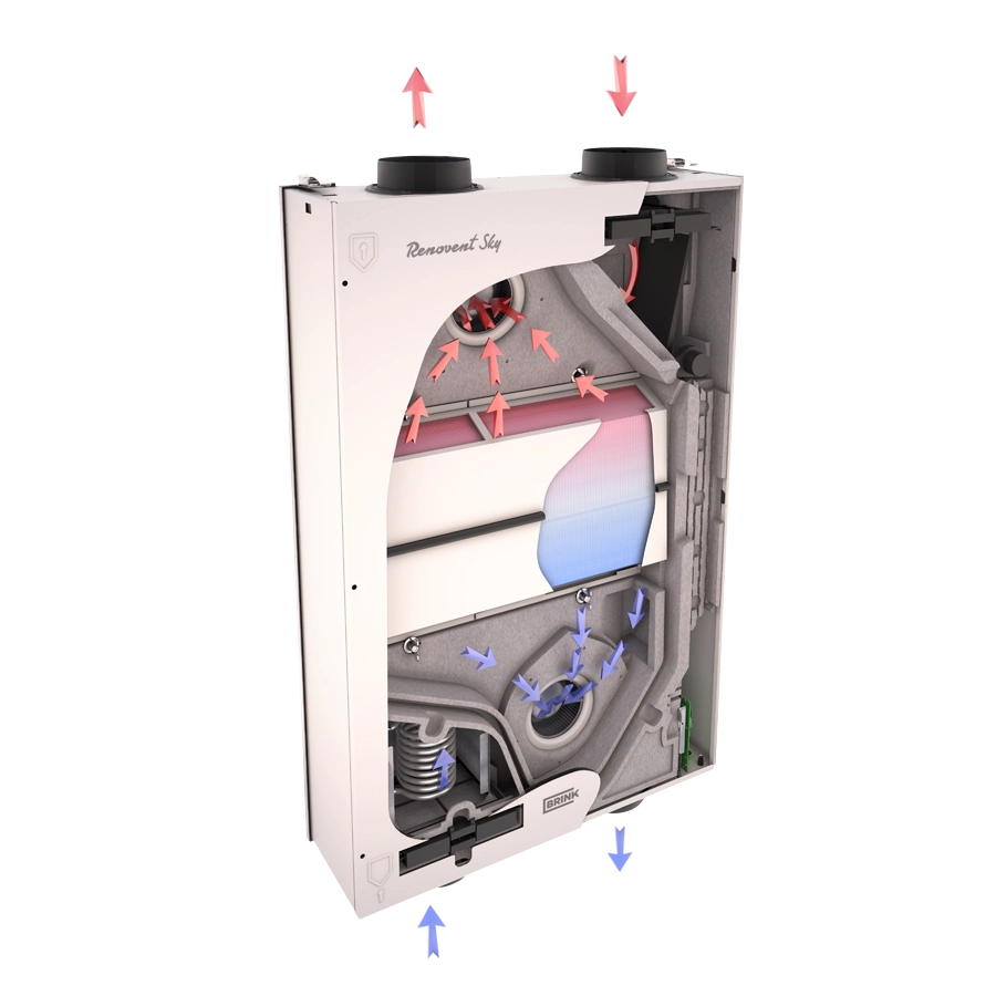 Visa Renovent Sky serija gali būti komplektuojama ne tik su standartiniu, bet ir su entalpiniu šilumokaičiu. Kadangi entalpiniame šilumokaityje nesusidaro kondensatas, nereikalingas ir kondensato nuvedimas – tai itin praktiška tiek naujuose nedideliuose, tiek renovuojamuose būstuose, kur rekuperatoriui dažniausiai numatoma vieta virš pakabinamų lubų.